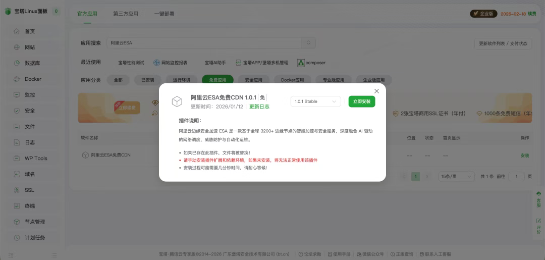 宝塔面板新增境内免费CDN!阿里云ESA一键部署,3个站点额度+全功能防护。