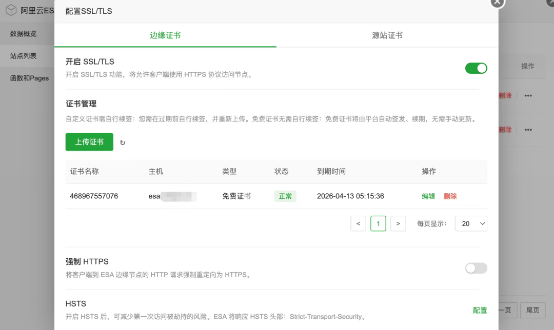- 边缘+源站双重证书管理,支持上传/同步证书