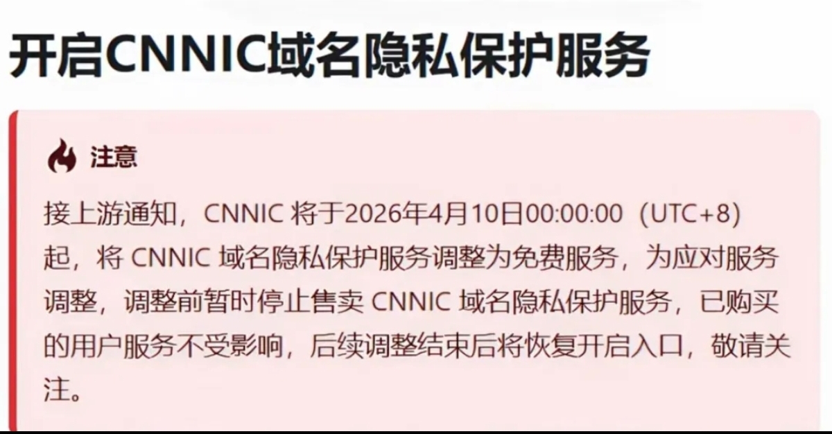 中国互联网络信息中心(CNNIC)正式官宣,自2026年4月10日 00:00起,面向国家顶级域名(.cn / .中国)的隐私保护服务将调整为免费提供。此前该服务多为付费增值项,此次调整旨在降低用户成本并提升域名安全基线。